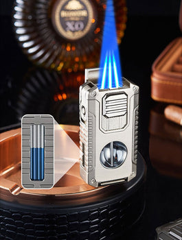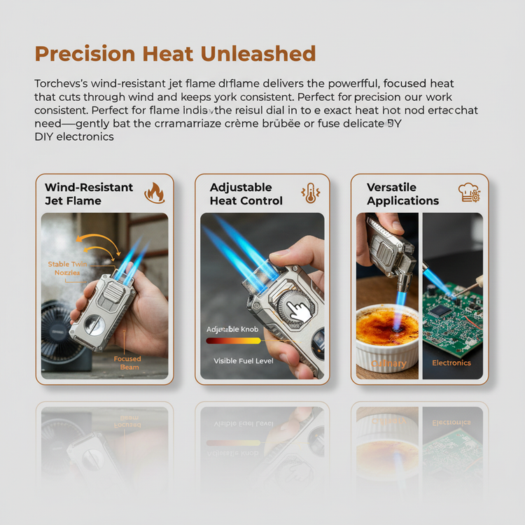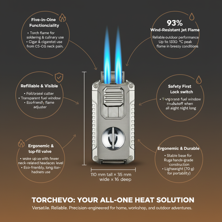 Meet Torchevo, your all-in-one torch solution for cooking, crafts, and smoking. It features a refillable fuel window, adjustable flame knob, and wind-resistant jet flame. Built-in cutters and punch simplify foil, seal, and cigar cap removal for maximum convenience.